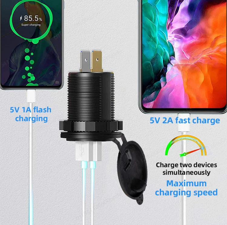 La toma USB doble de 12V permite cargar dos dispositivos al mismo tiempo de forma segura y estable. Ideal para coches, campers, autocaravanas, camiones y embarcaciones.